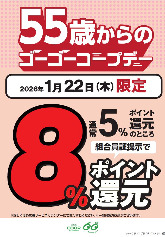 コープさっぽろ(本部・札幌市西区)は、55歳以上の組合員を対象に毎週木曜日に実施している「ゴーゴーコープデー」の5%ポイント還元に加え、2026年1月22日(木)から月1回、ポイント還元率を8%に引き上げる取り組みを開始する。
